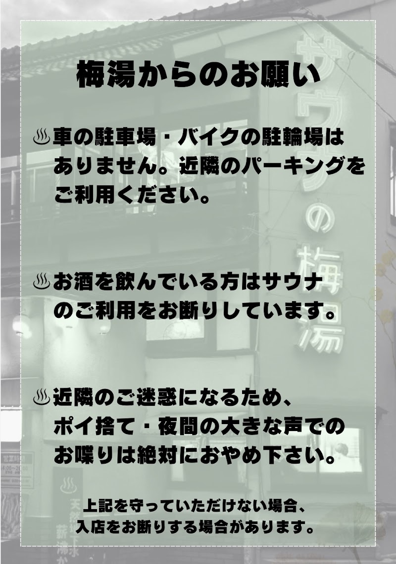 5件A Refreshing Stop Before a Night Out On this day, I had a work gathering in the evening. Since I still had some time before the gathering started, I thought, “Why not take a bath first?” So I visited the public bathhouse “Sauna no Umeyu” in Shimogyo Ward, Kyoto. Stopping by a bathhouse before a night out has become my personal routine. Kyoto still has many traditional public bathhouses, and Umeyu is one of the most popular among them. ⸻ A Bathhouse with a Nostalgic Atmosphere Even from the outside, Umeyu has a nostalgic feel. The large neon sign and lanterns create a retro atmosphere that’s worth experiencing. Once you pass through the noren curtain at the entrance, you’re greeted by the familiar atmosphere of a traditional Japanese bathhouse. The reception counter, lockers, and tiled bathing area all give off a Showa-era vibe, yet the place is clean and very comfortable. Many tourists visit as well, since it’s known as a place where you can experience Kyoto’s traditional bathhouse culture. ⸻ Relaxing in the Bath Inside the bath area, there’s a spacious tub where you can soak and warm your body at a relaxed pace. As I soaked in the hot water, the fatigue from work slowly melted away. The baths at a public bathhouse always feel different from those at home—the warmth reaches deep into your body. There’s also a sauna, so I took my time enjoying it. I completed three sets of sauna → cold bath → rest, which felt fantastic. ⸻ If You Want to Visit a Public Bath in Kyoto Sauna no Umeyu is a bathhouse loved by both locals and tourists. It’s a great place to stop by during sightseeing in Kyoto, and I also recommend it the way I use it—taking a relaxing bath before heading to a night out. If you’d like to experience Kyoto’s bathhouse culture, this is definitely a place worth visiting at least once.